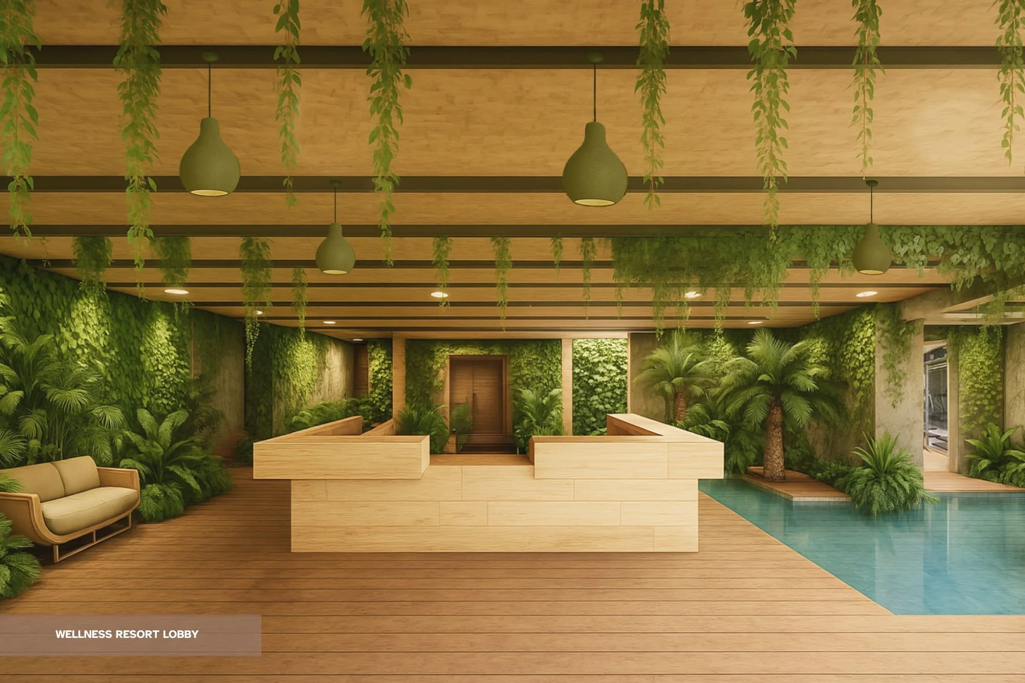 The renderings are inspired by Costa Rica’s lush landscape. The goal was to bring the outdoors inside and enclose guests in a tropical oasis due to the benefits of biophilic design. Neutral tones and sustainable materials were selected as well.